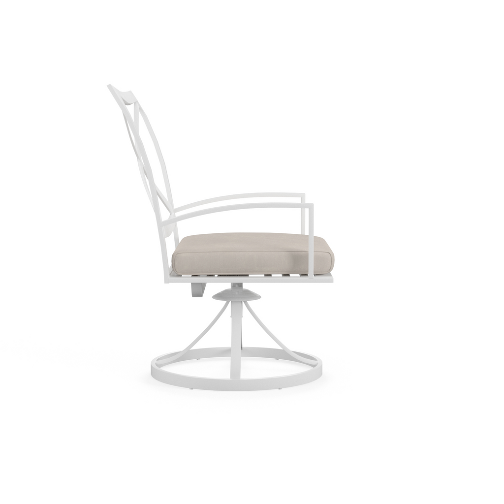 The Bristol Swivel Dining Chair is rendered in high quality, low-maintenance aluminum that will stand the test of time. This chair features a gently curved X back and seat scaled for comfort, with swivel base and subtly curved arms.