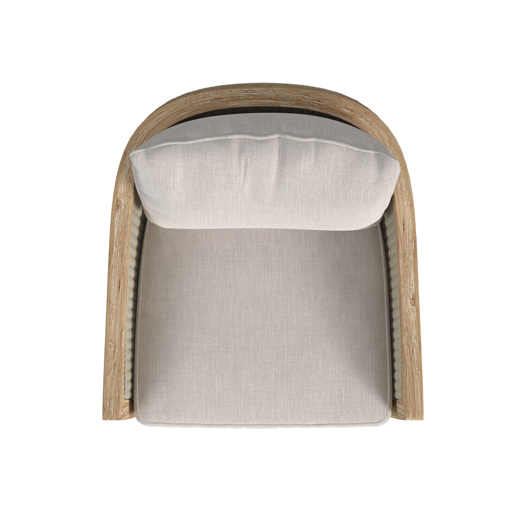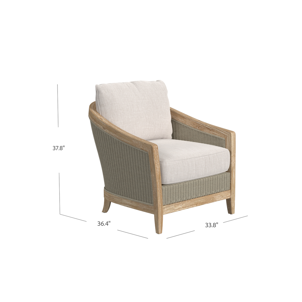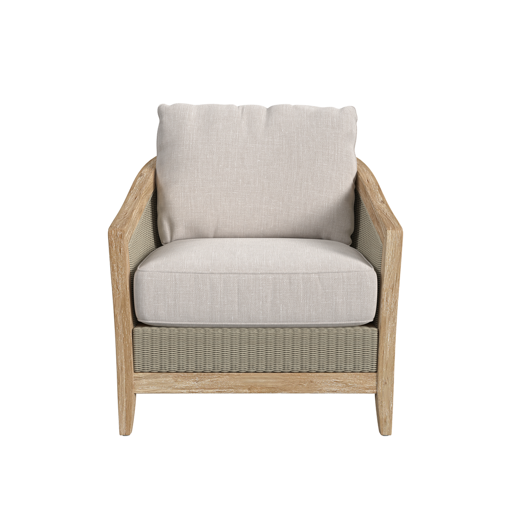 Sunset West's Cambria Barrel Back Club Chair is inspired by classic silhouettes, designed with with contemporary materials. With mixed material of resin and solid teak wood, Cambria features the signature coastal teak finish and textured Latte weave. It's curved silhouette with flared skirt, barrel back and sloped arm brings maximum style and comfort.