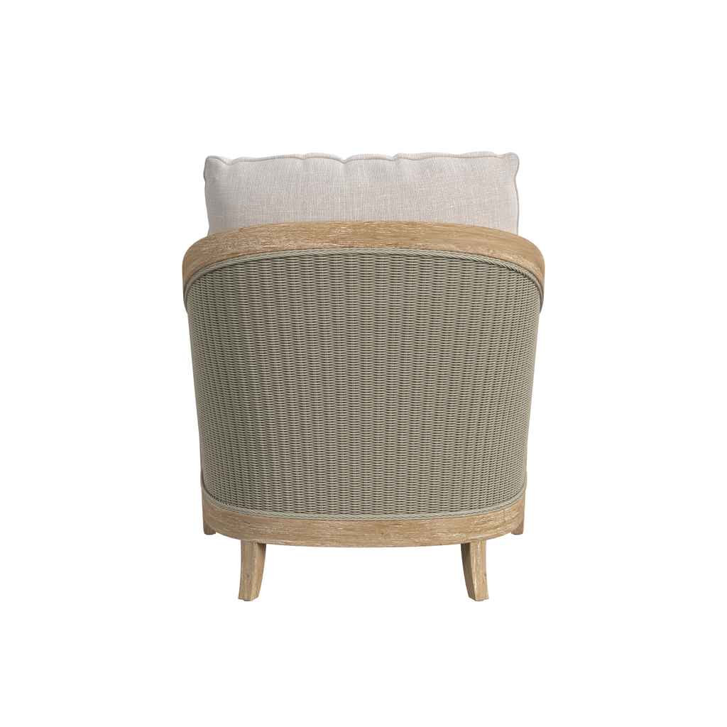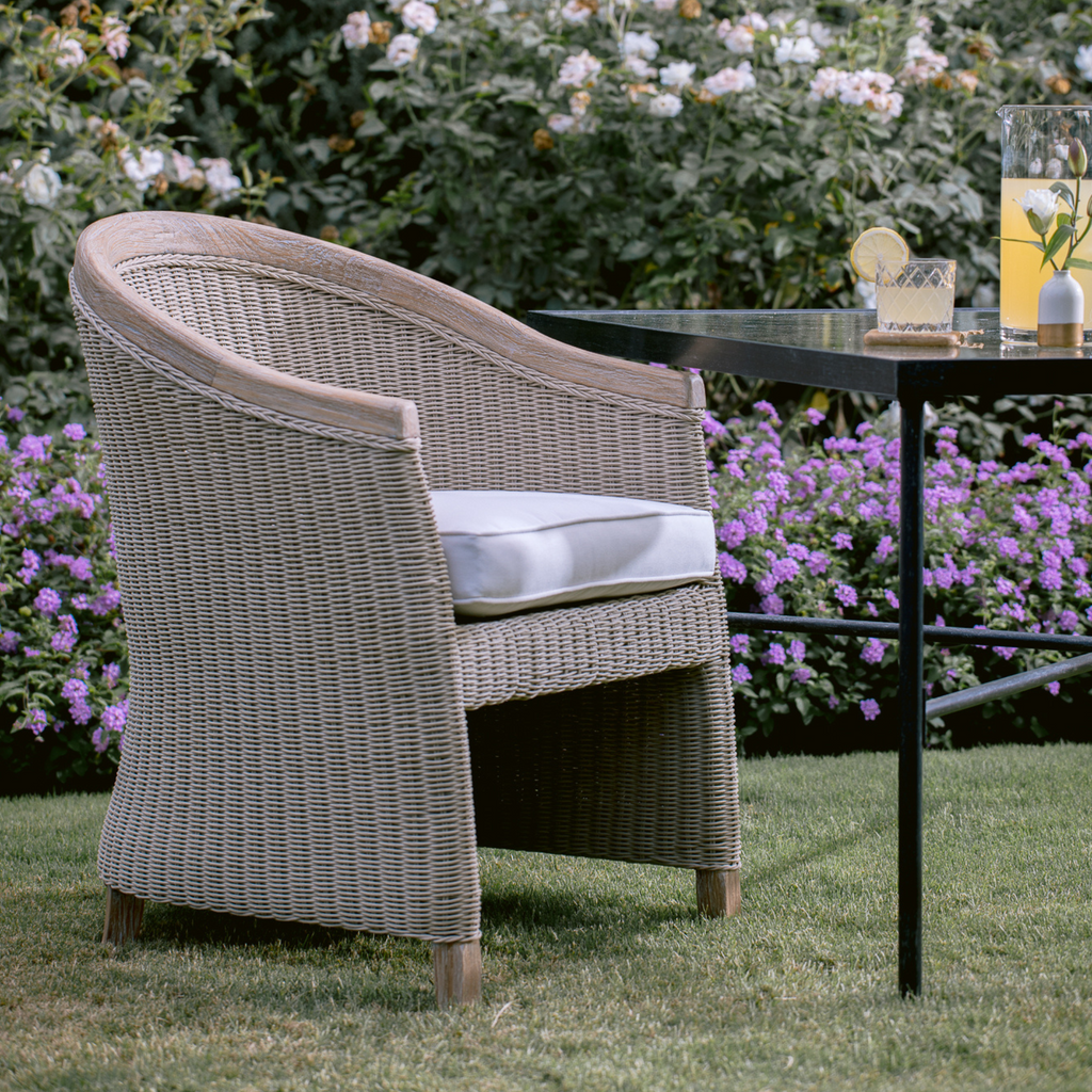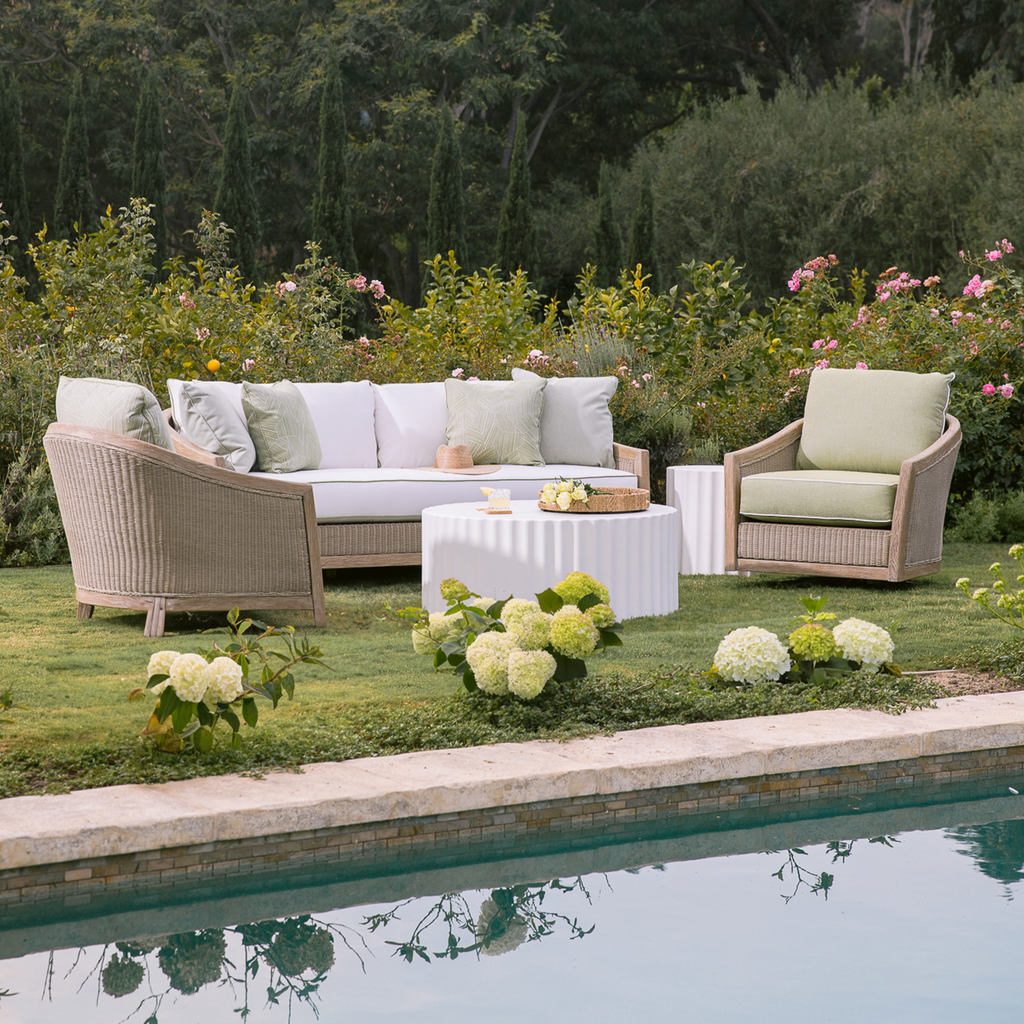 Sunset West's Cambria Barrel Back Club Chair is inspired by classic silhouettes, designed with with contemporary materials. With mixed material of resin and solid teak wood, Cambria features the signature coastal teak finish and textured Latte weave. It's curved silhouette with flared skirt, barrel back and sloped arm brings maximum style and comfort.