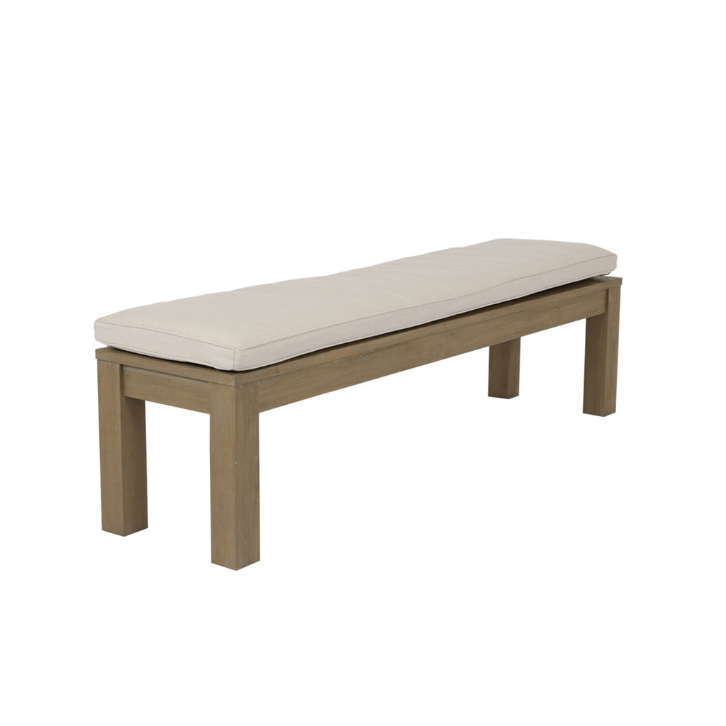 Sunset West's Coastal Teak Dining Bench is a beautifully contemporary take on classic teak furnishings. Its open silhouette and sleek, angular lines are thoughtfully complemented seamless joinery. Our unique multi-step finish gives the natural wood a warm grey color, complementing our other collections for the perfectly curated coastal design.