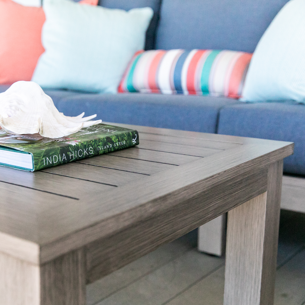 The Laguna Coffee Table is styled with tailored plank top and block legs in our signature driftwood finish.