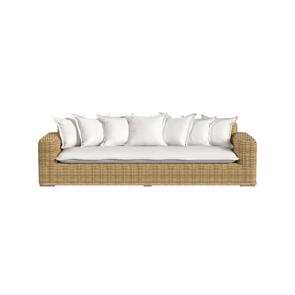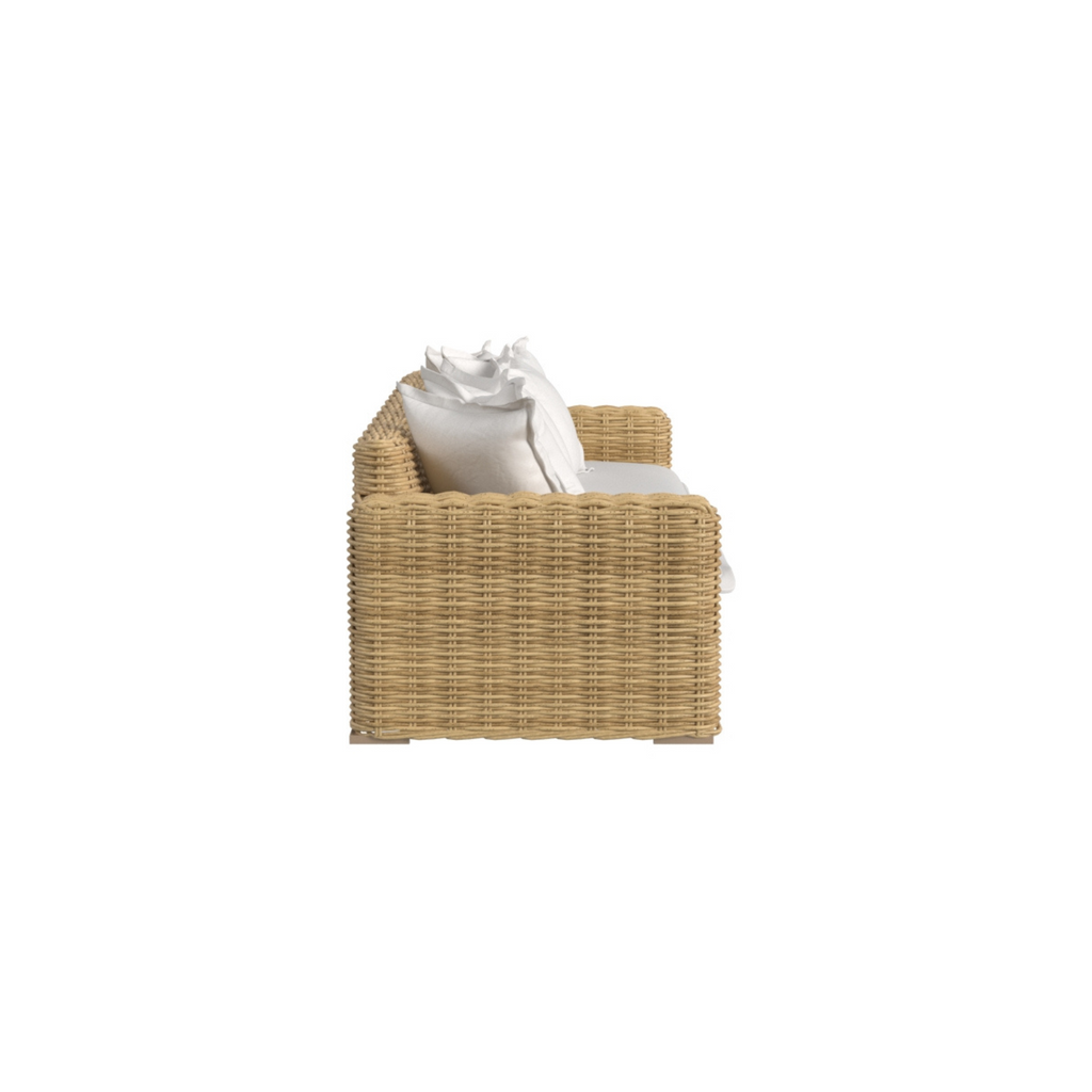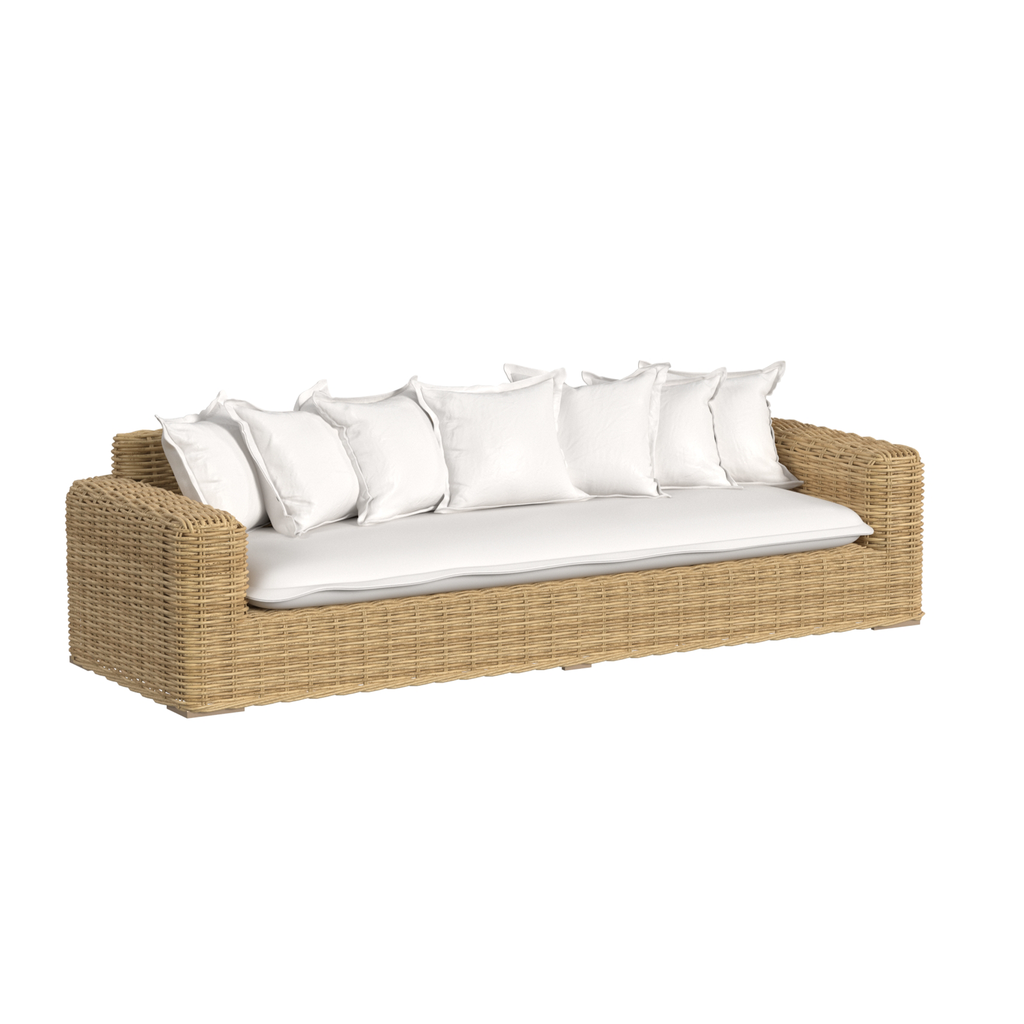 Sunset West's Playa Large Sofa features deep seating with an oversized frame and track arm for sumptuous comfort. Sink into its plush pillow cushions for luxurious relaxation. Crafted with Resin wicker in a Natural finish, bring a tropical feel to any outdoor space.