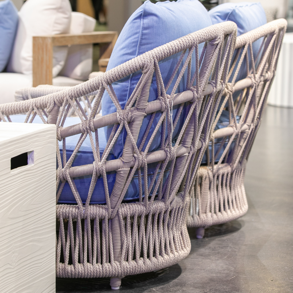 The Dana Club Chair is the perfect balance of intricate pattern combined with an organic, free flowing aluminum structure. This macramé inspired frame features a curved back and sloped arm, expertly wrapped in premium all-weather olefin rope in natural Linen.