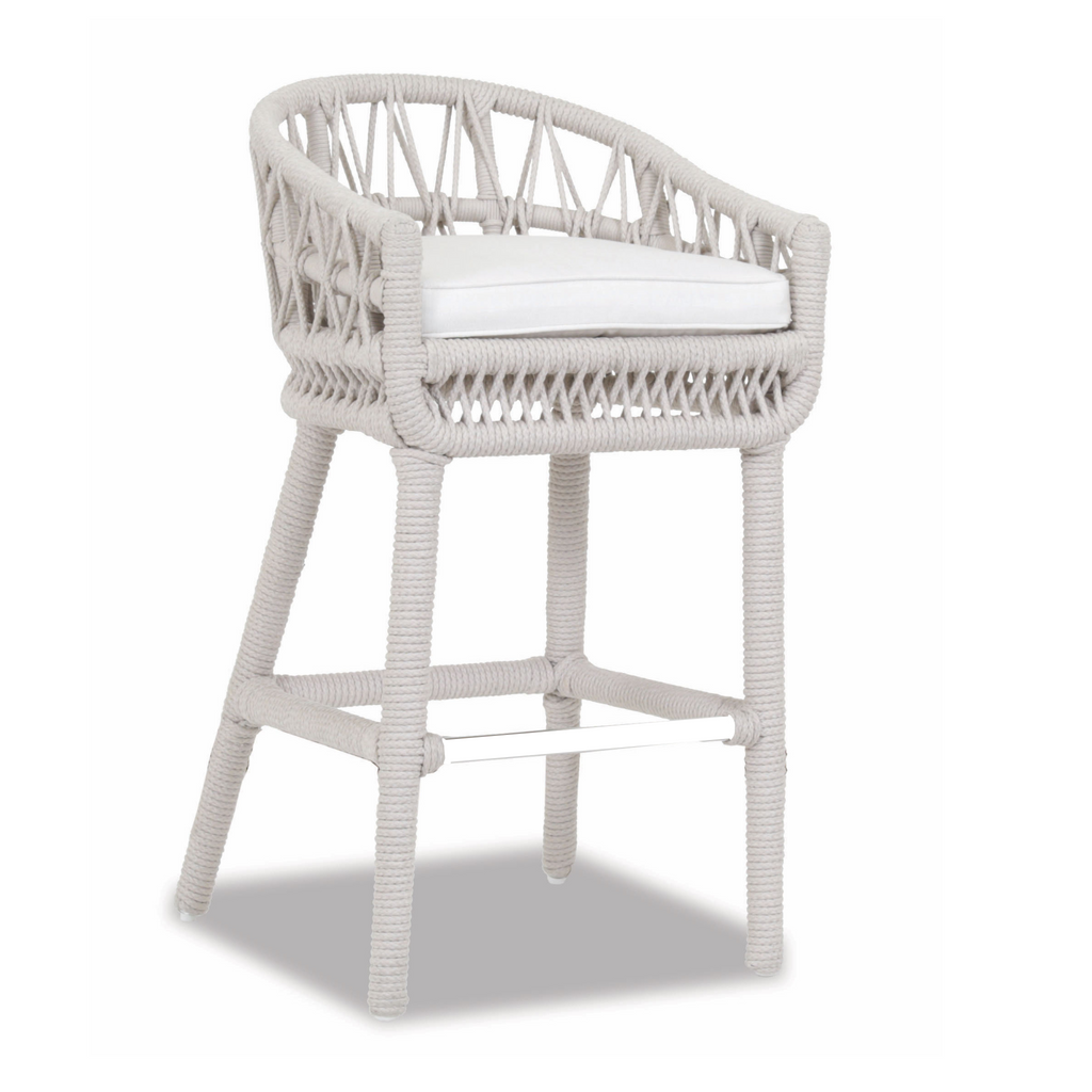 The Dana Barstool is the perfect balance between intricate pattern combined with an organic, free flowing aluminum structure. The macramé inspired bucket frame features a curved back and sloped arm, expertly wrapped in premium all-weather olefin rope in natural Linen.