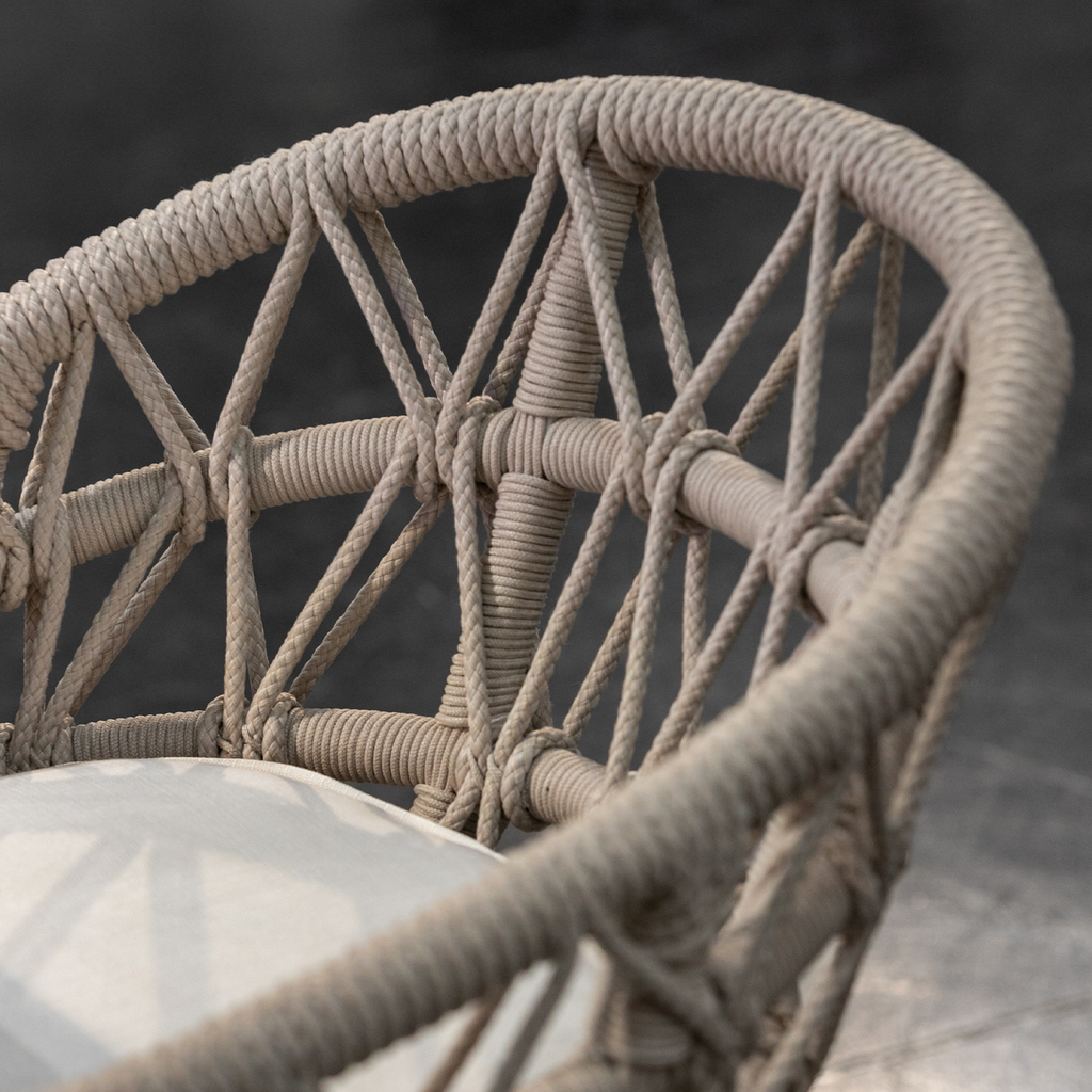 The Dana Dining Chair is the perfect balance of intricate pattern combined with an organic, free flowing aluminum structure. The macramé inspired bucket frame features a curved back and sloped arm, expertly wrapped in premium all-weather olefin rope in natural Linen.