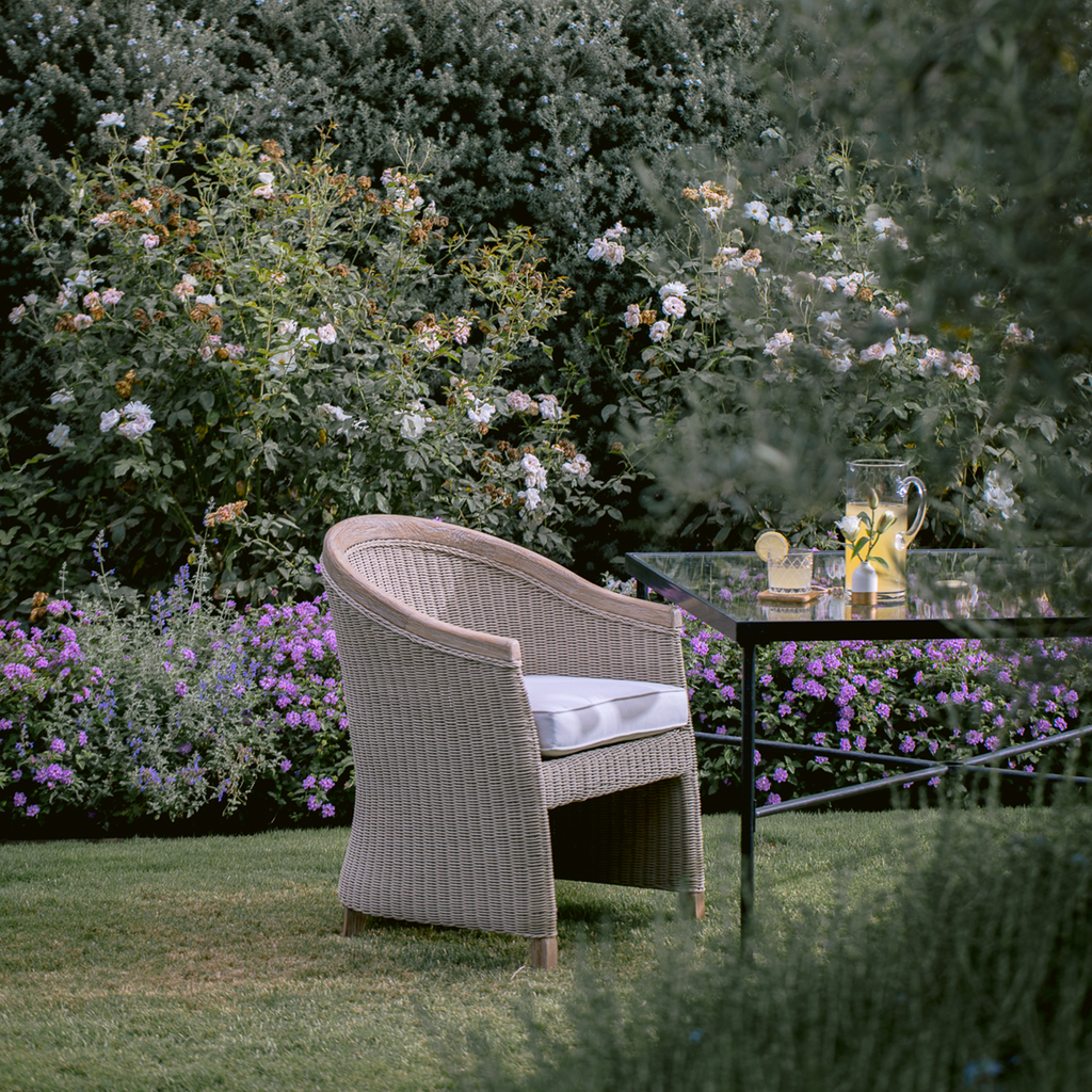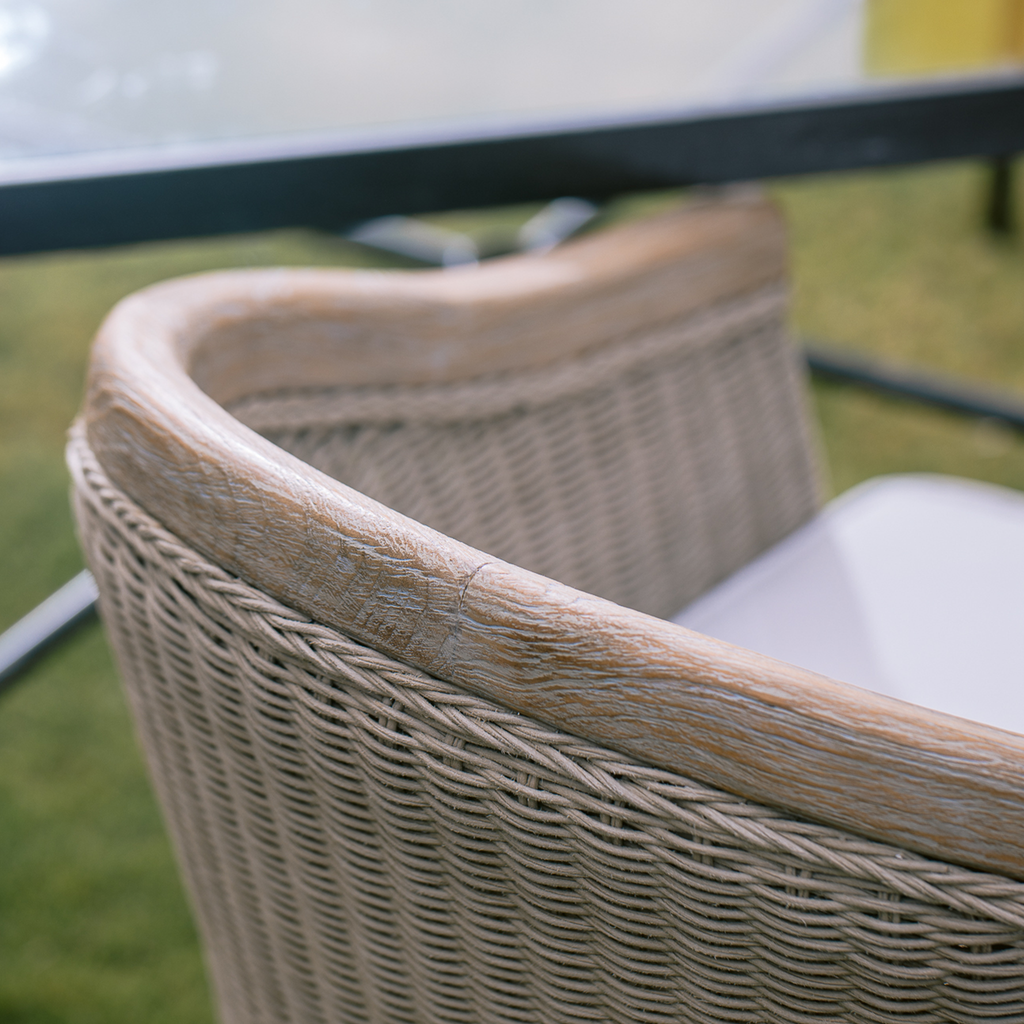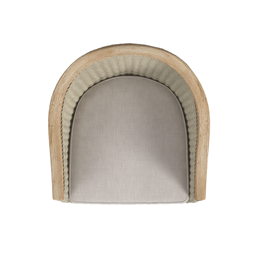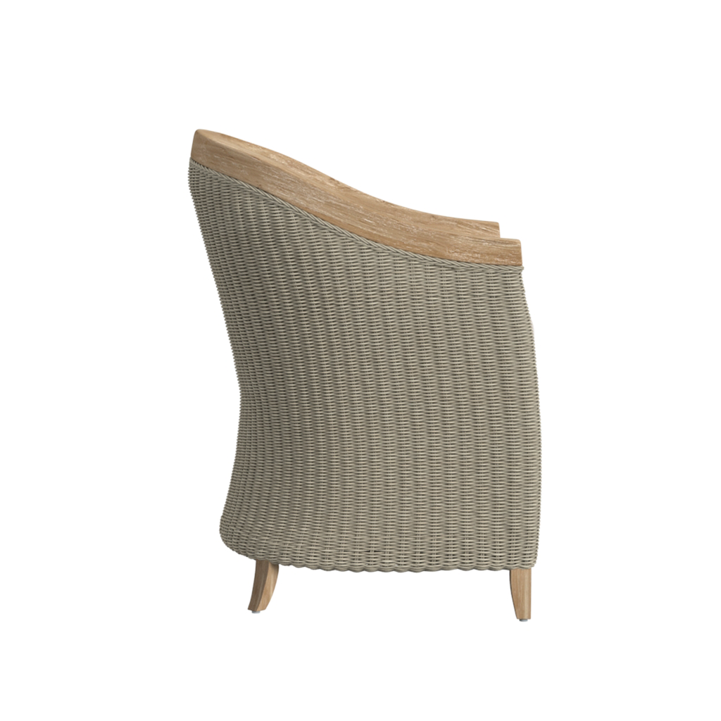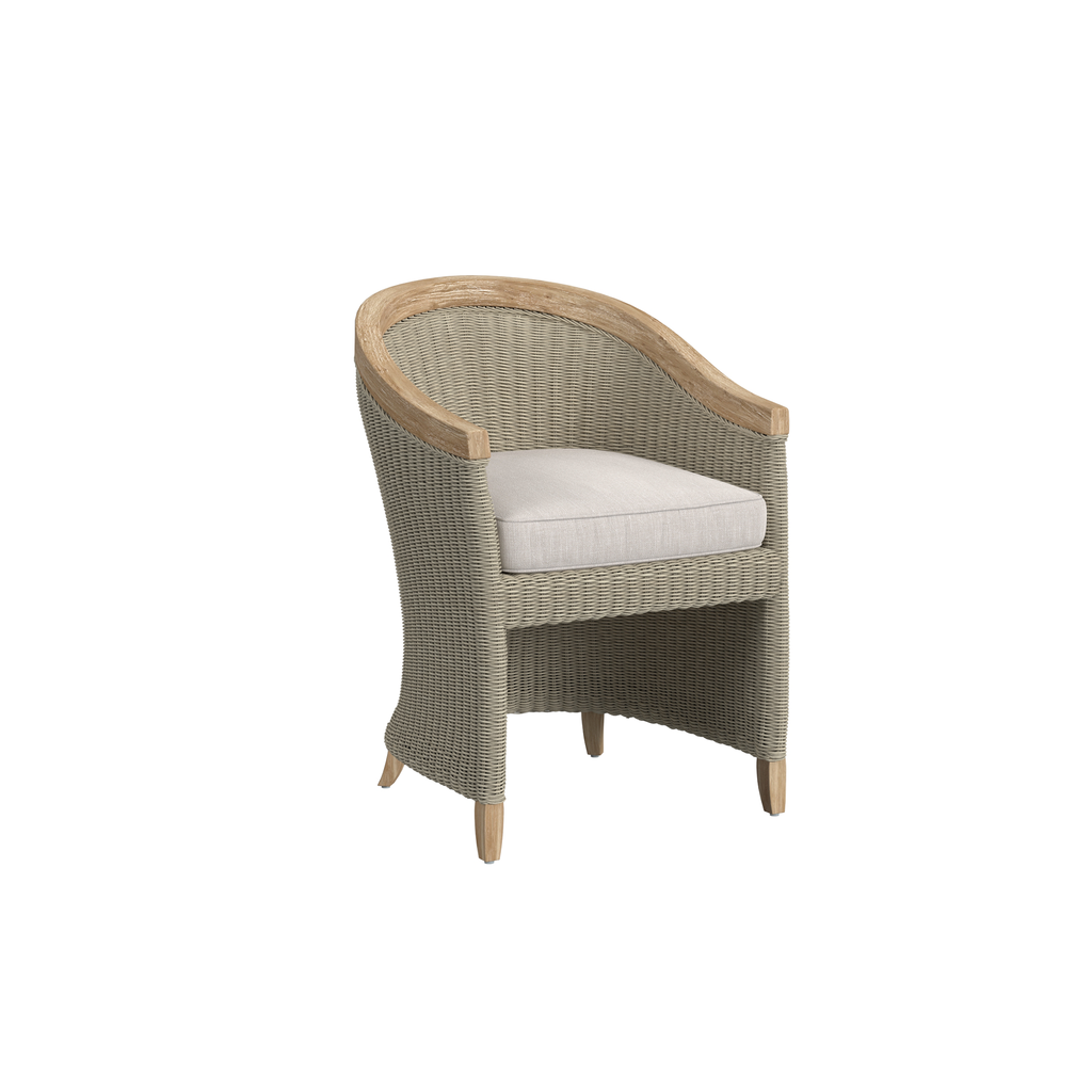 Sunset West's Cambria Barrel Back Dining Chair is inspired by classic silhouettes, designed with with contemporary materials. With mixed material of resin and solid teak wood, Cambria features the signature coastal teak finish and textured Latte weave. It's curved silhouette with flared skirt, barrel back and sloped arm brings maximum style and comfort.