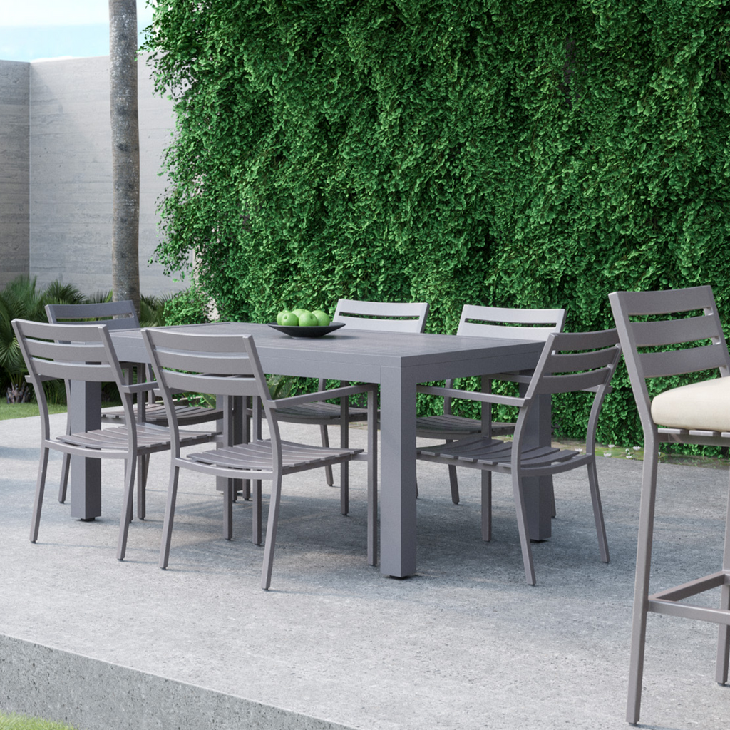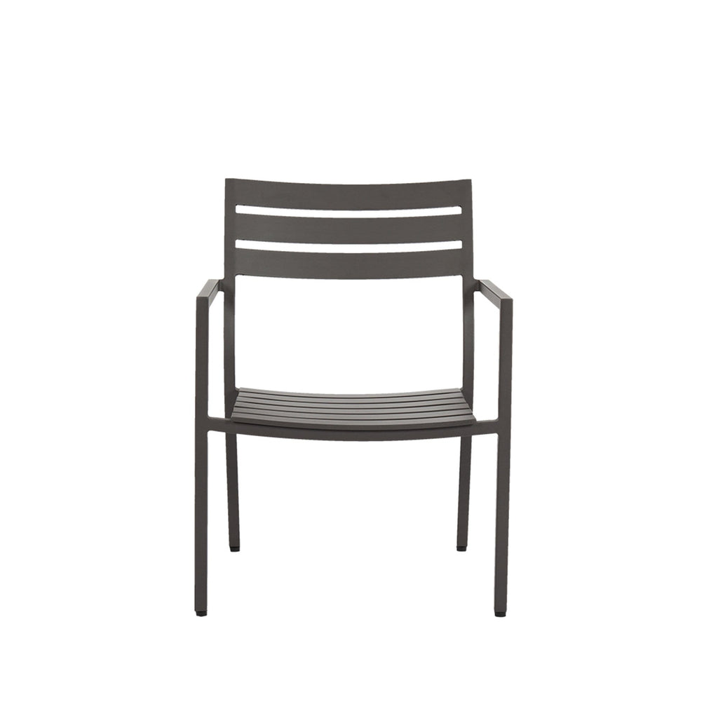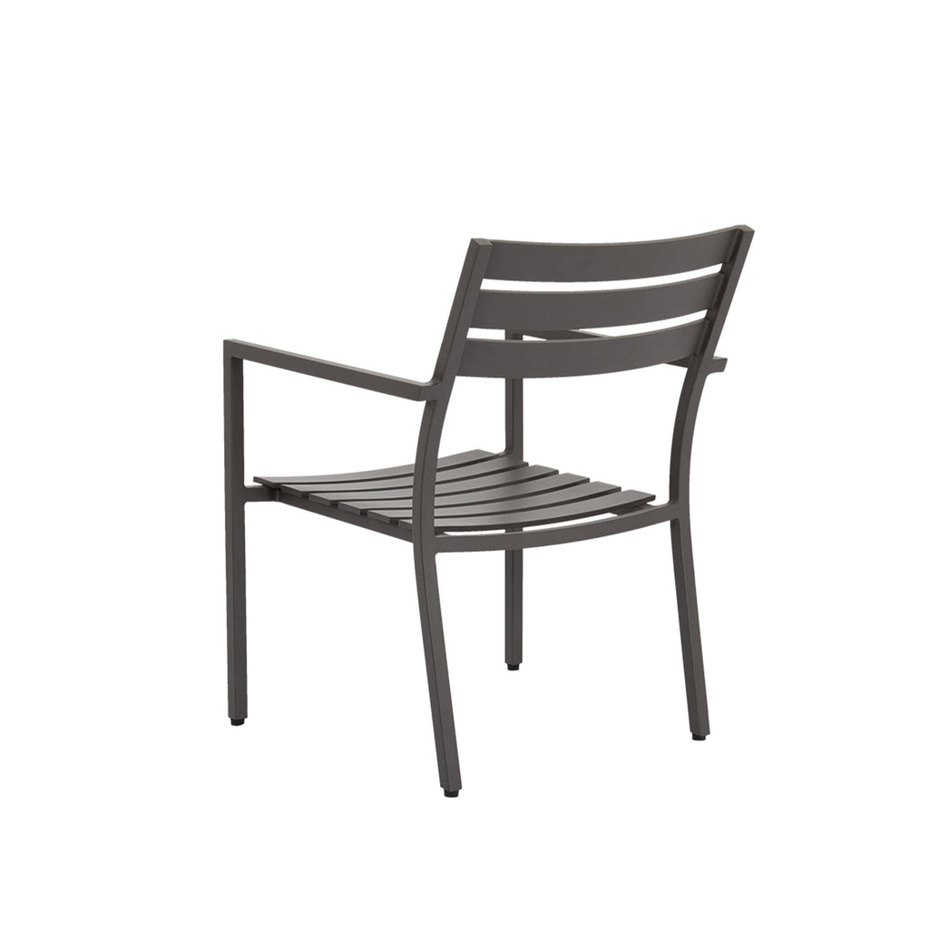 The Mesa Collection favors understated lines over embellishment, for a timeless look rendered in graphite powder coated aluminum. The Mesa Dining Chair features a slat back and seat, with stackable frame for easy storage.