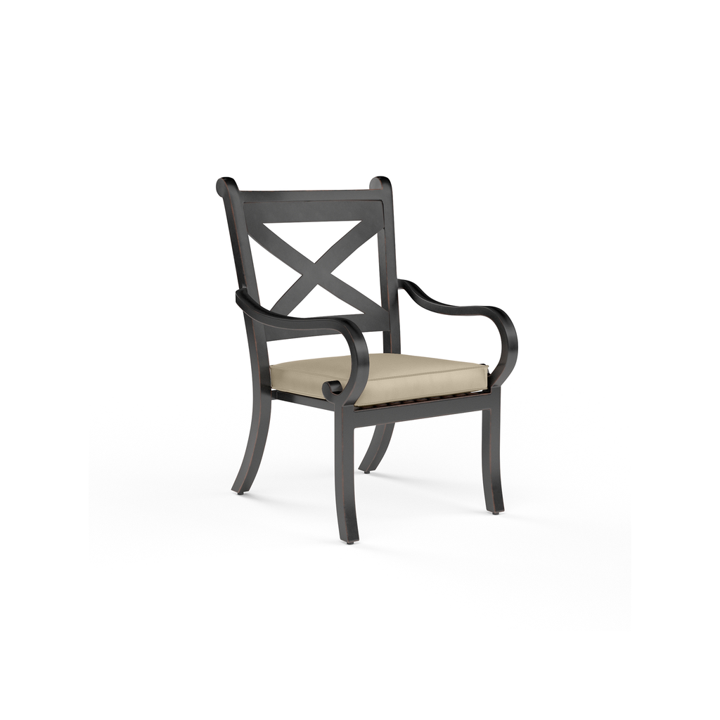 The Monterey Dining Chair incorporates organic lines with a stately frame, featuring a curled arm and cross back detail. Monterey is constructed in long-lasting aluminum, with an Espresso powder coat and Old World Copper Rub, for a beautiful look and finish that will stand the test of time with minimal maintenance.