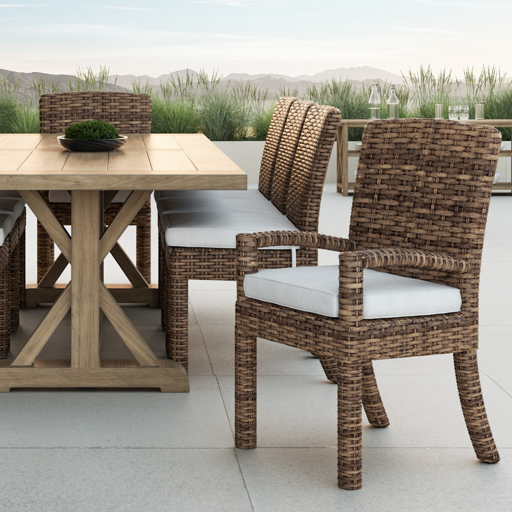 Crafted in the highest quality comfort and durability, The Havana Dining Chair features gently sloped arms, and an aluminum frame wrapped with premium all-weather wicker in a rich Aged Tobacco finish.