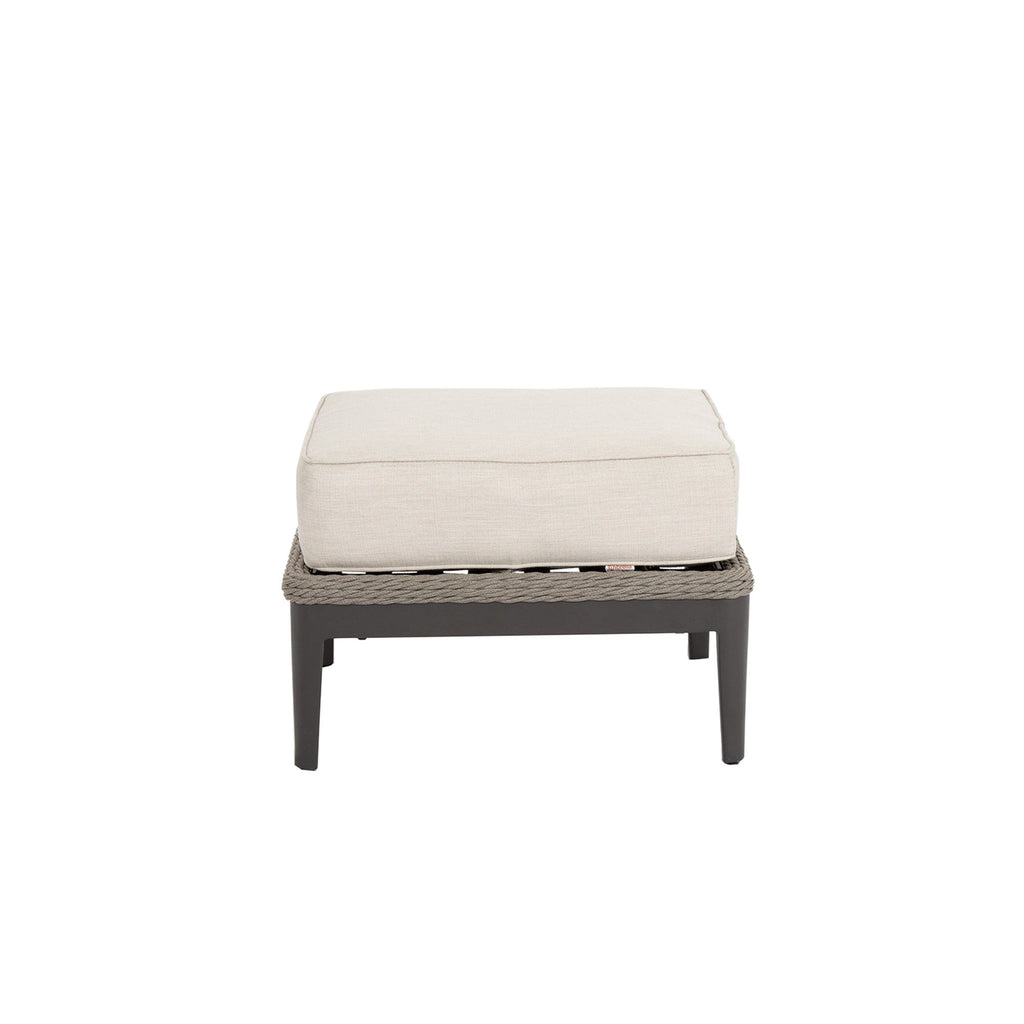 The Marbella Ottoman features a braided rope design plush 6" box cushion, and tapered leg in powder-coated aluminum.