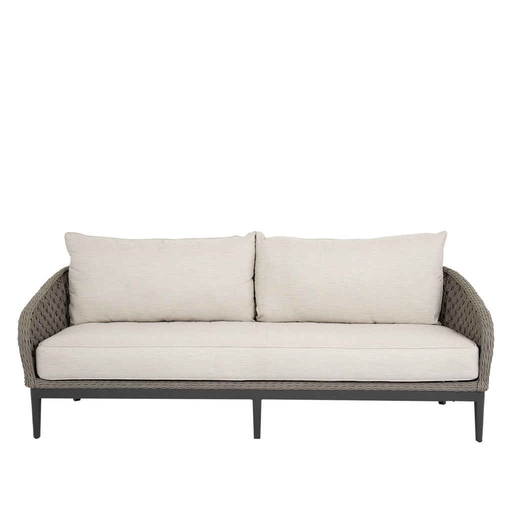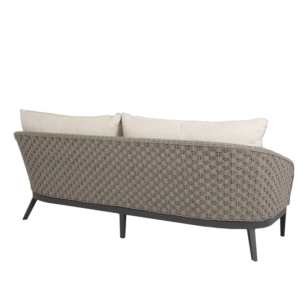 The Marbella Sofa offers a mid-century style frame with curved back and sloping arms, with tapered legs in Graphite powder-coated aluminum. Plush 6" cushions and pillow back offer ultimate comfort.