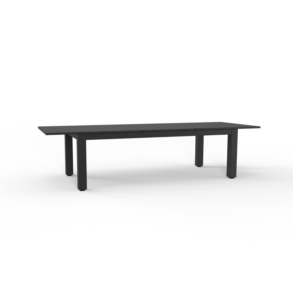 The Redondo 90-120" Extension Dining Table blends modern and industrial sensibility into one striking design, featuring a slat table top and linear frame, crafted in powder coated aluminum in a hand-brushed Slate finish.