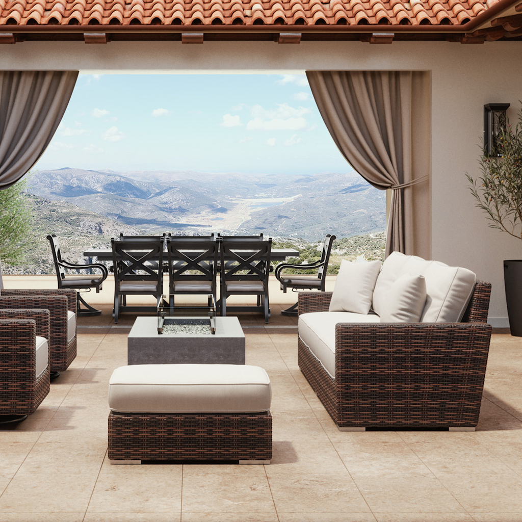 Inspired by the coastal town of its namesake, The Montecito Mid Sofa offers purely sophisticated outdoor living. Expertly wrapped in a rich Cognac multi-colored weave, Montecito mimics natural materials with low maintenance in durable virgin resin wicker. Offering advanced seating support, the mid sofa is perfectly scaled for smaller spaces and seats two comfortably.