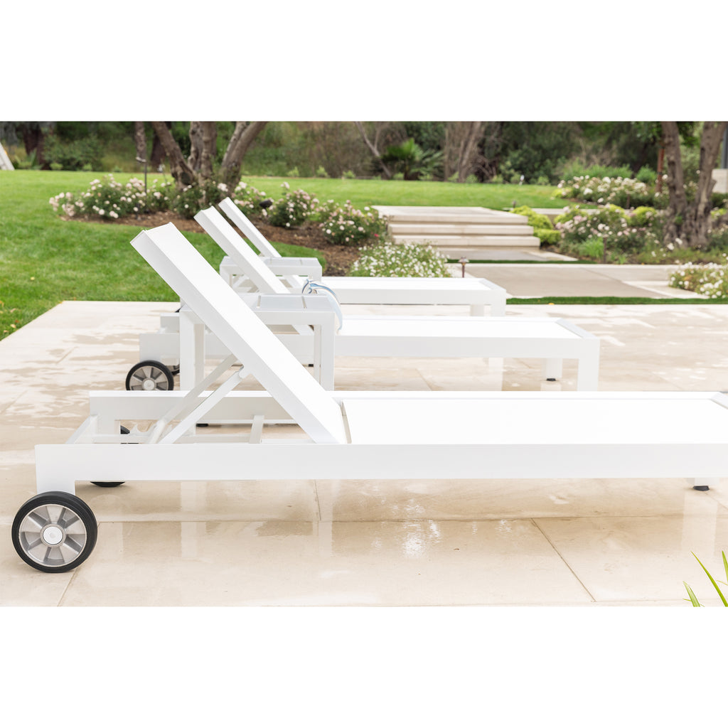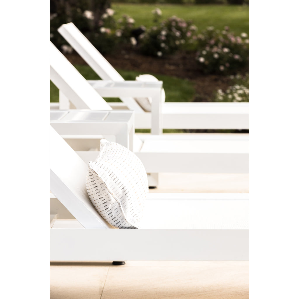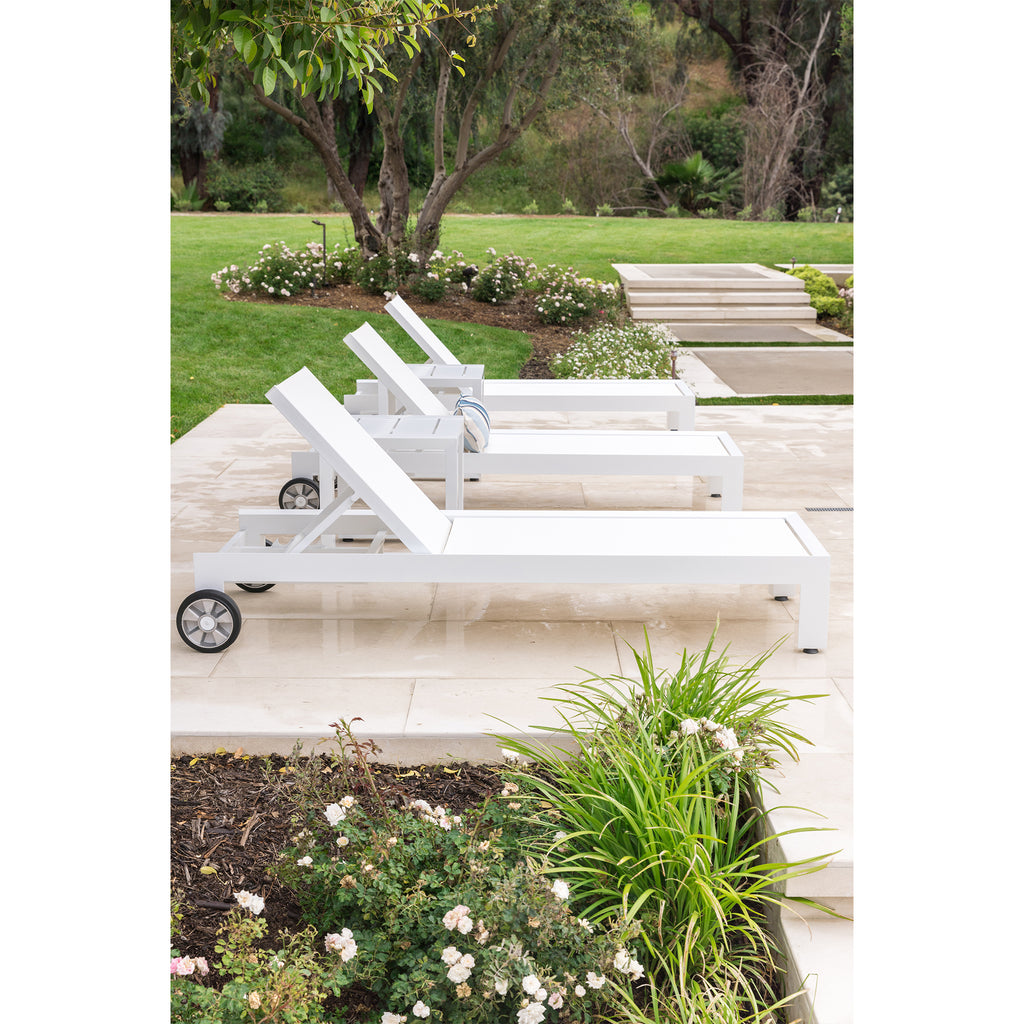 The Newport Sling Chaise blends modern and industrial sensibly into one striking design, featuring an armless linear frame and Frost sling seat. Crafted in powder-coated aluminum with a Satin white finish, this chaise offers 5 adjustable positions for customized lounging.