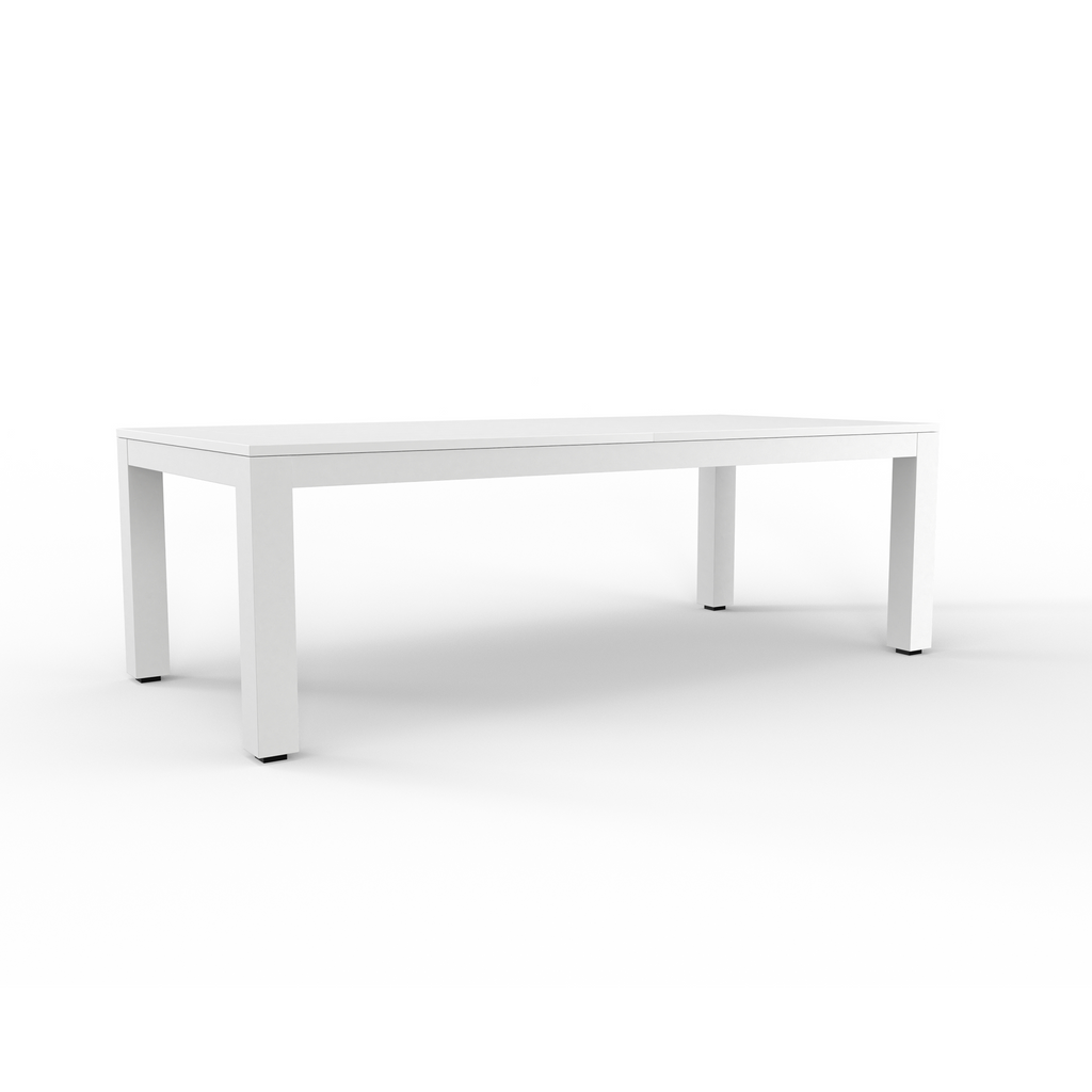 The Newport 90-120" Extension Dining Table blends modern and industrial sensibility into one striking design, featuring a slat table top and linear frame, crafted in powder coated aluminum in a Satin White finish.