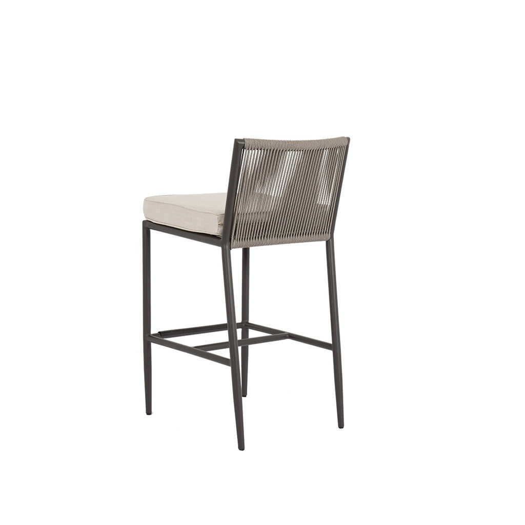 Informed by mid-century design, Pietra Barstool incorporates the best of classic proportions with modern materials. Inspired by the subtle tones of natural stone, this piece is rendered in a matte Graphite aluminum with vary-colored Shale all-weather rope. It features a rounded tube frame and mid-rise back, that is perfectly scaled for smaller spaces and casts a compelling profile. Pairs well with the Vegas Pub Table to complete your outdoor dining set.
