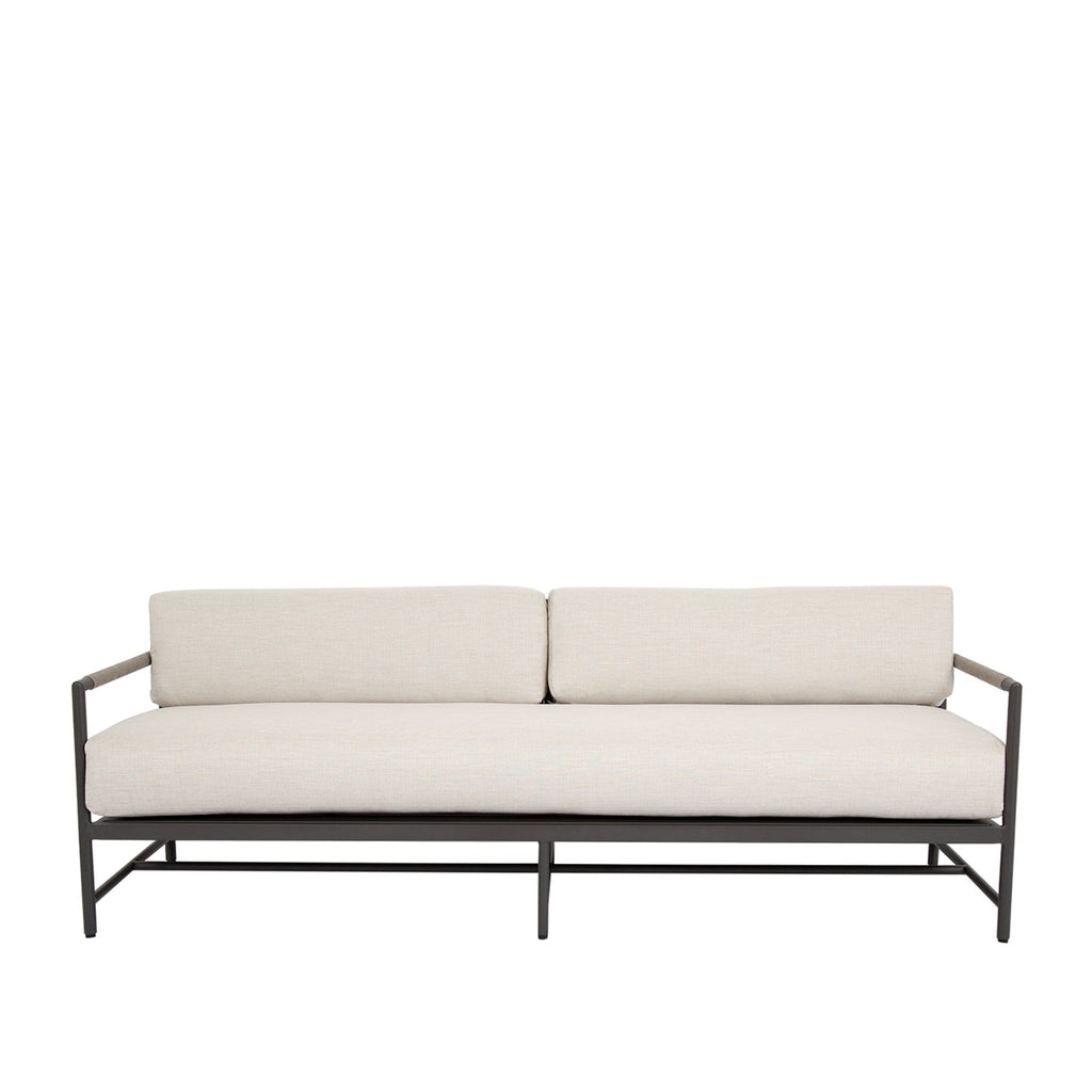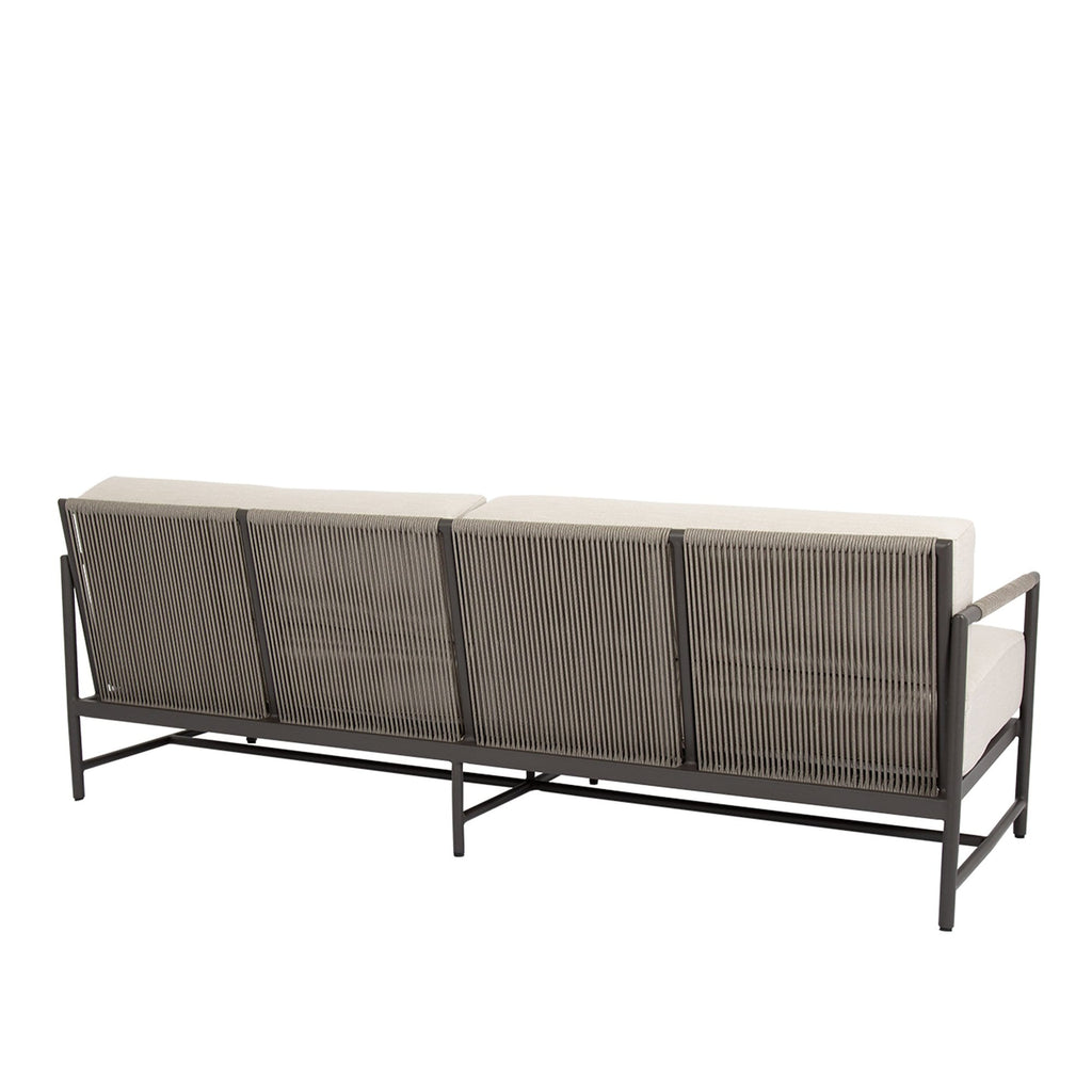 Informed by mid-century design, the Pietra Sofa incorporates the best of classic proportions with modern materials. Inspired by the subtle tones of natural stone, this piece is rendered in a matte Graphite aluminum with vary-colored Shale all-weather rope. It features a rounded tube frame and mid-rise back, that is perfectly scaled for smaller spaces and casts a compelling profile.