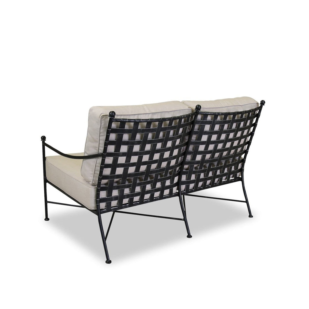 Constructed in expertly crafted wrought iron, the Provence Loveseat displays a woven back to emulate basket weave, and subtly brushed Century Pewter antique finish. Gently bowed arms and generous seat are scaled for absolute comfort.