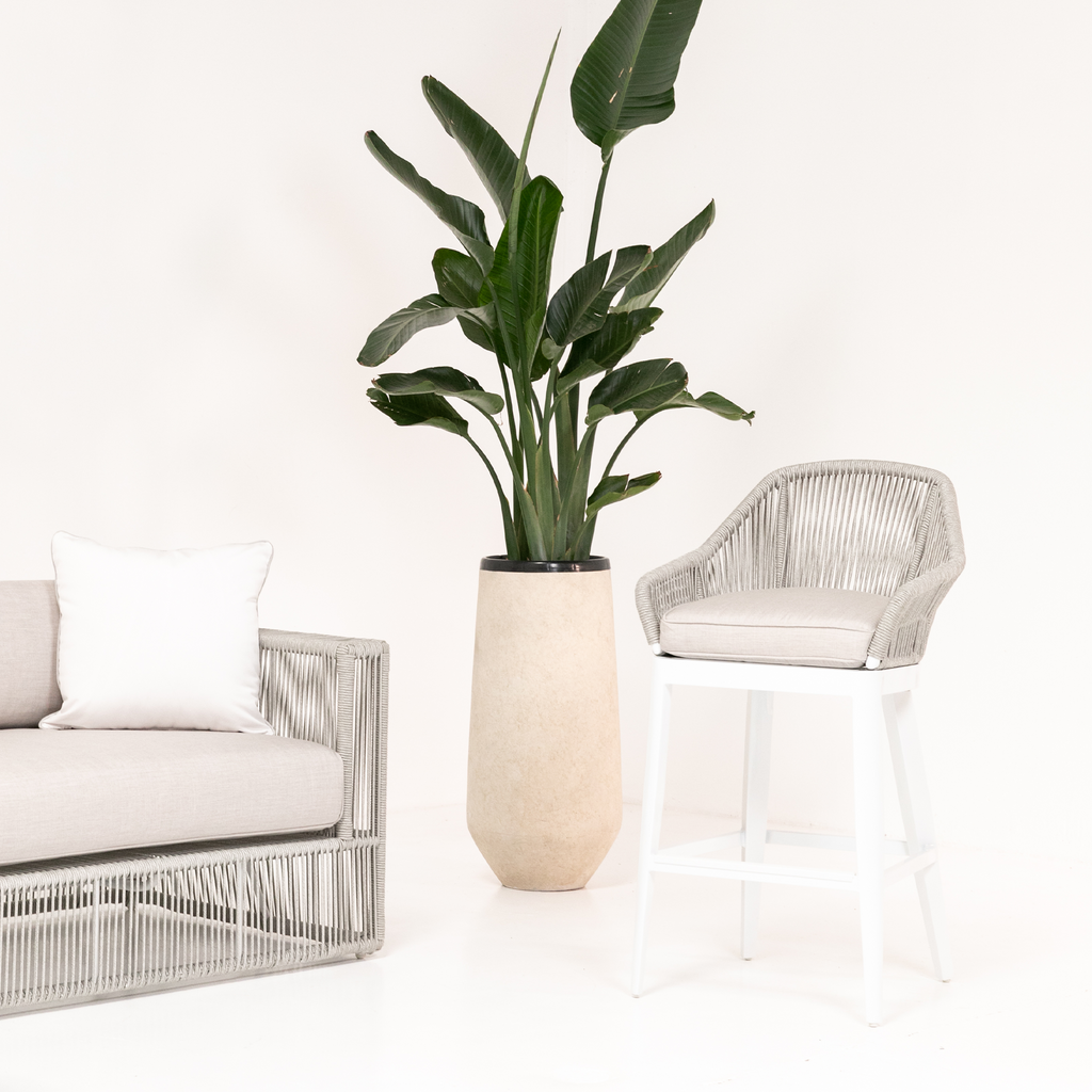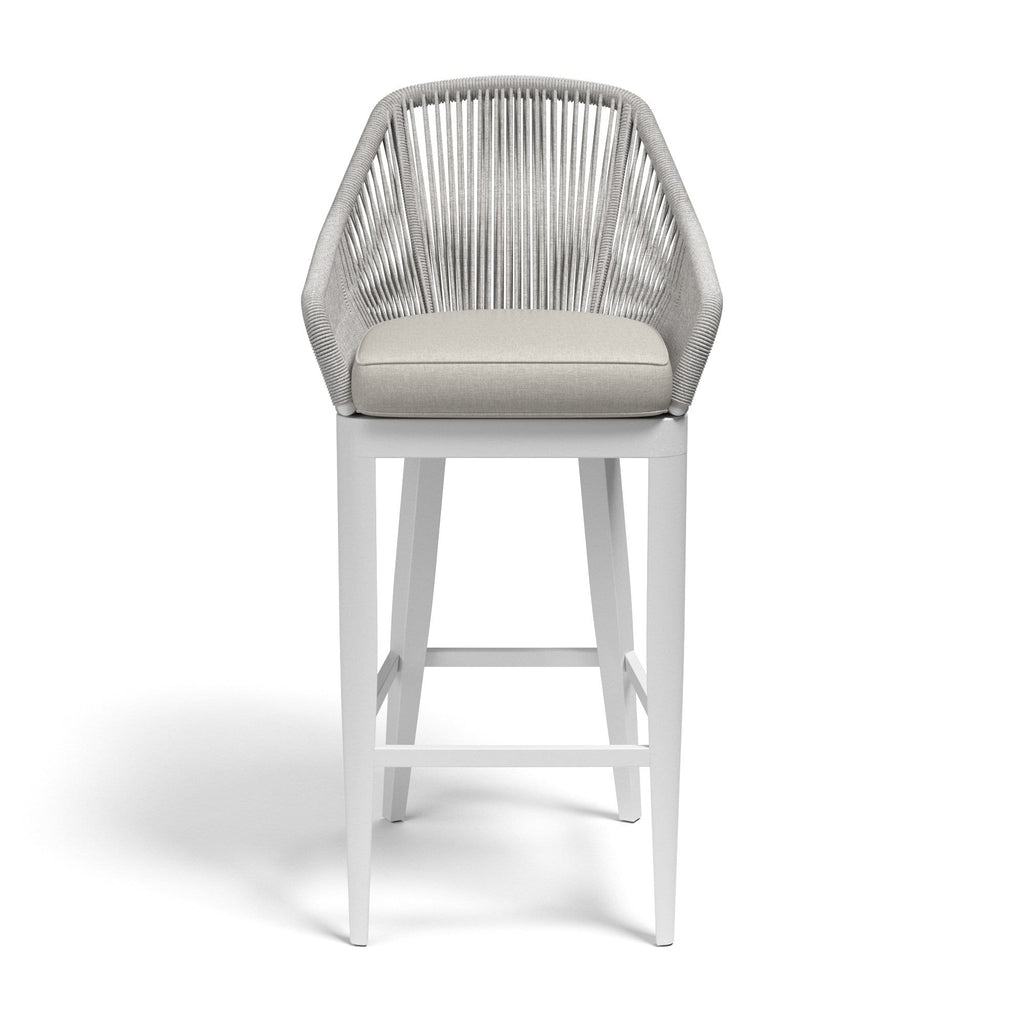 The Miami Barstool embodies clean lines and thoughtful angles with its linear frame and striated rope design. Its rust free aluminum frame is expertly hand wrapped with premium all-weather olefin rope in a silver-grey, and is finished with a frost white tapered leg.