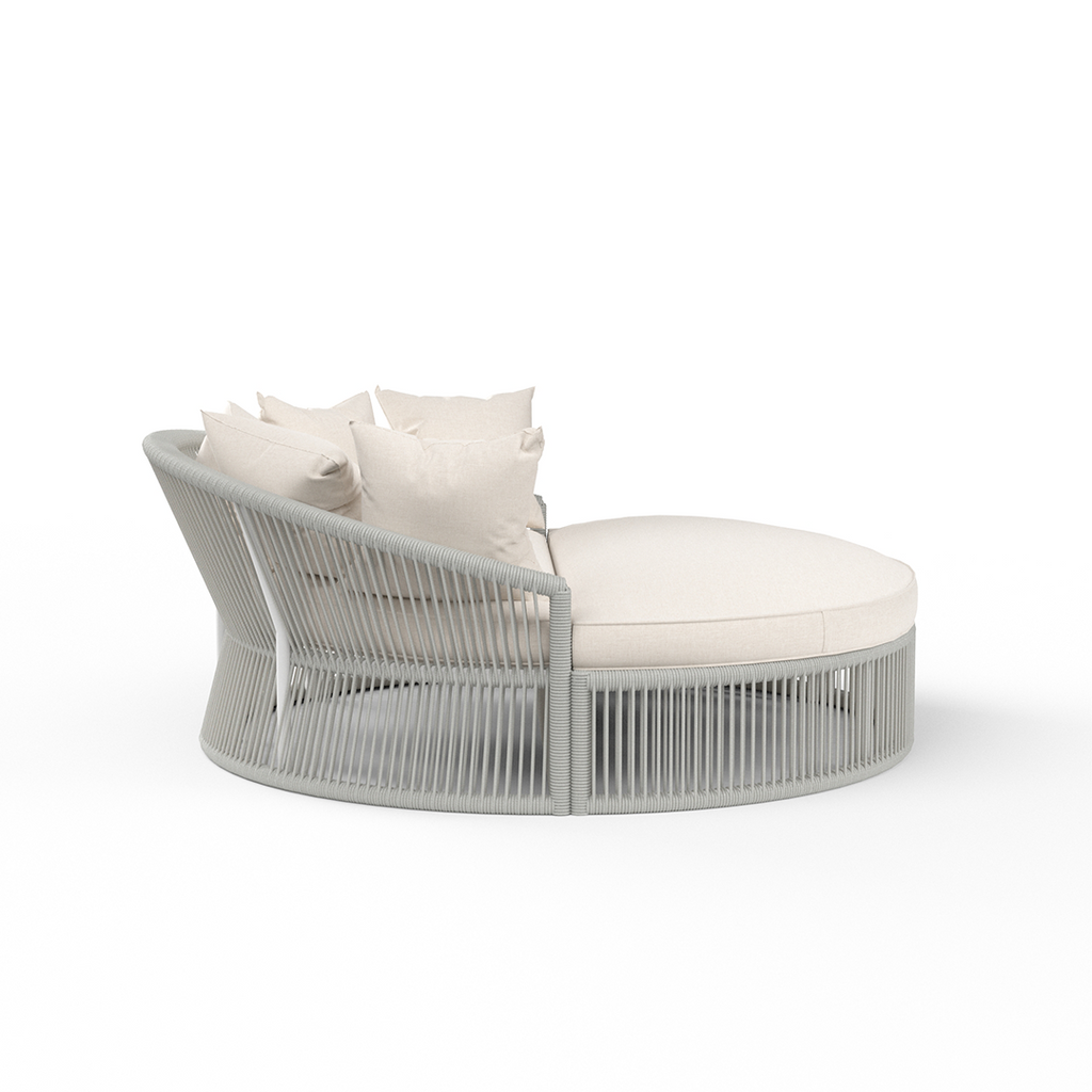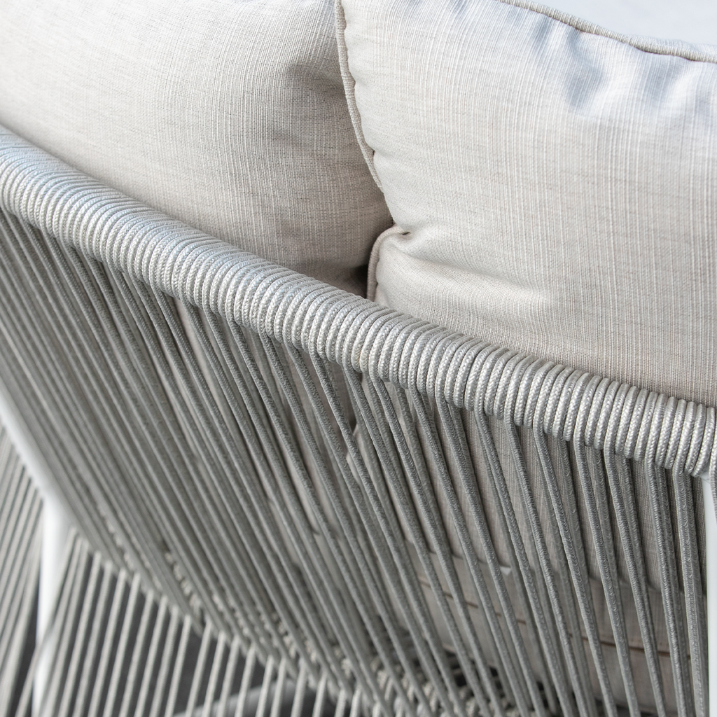 The Miami Daybed embodies clean lines and thoughtful angles with its curved frame and striated rope design. Its rust free aluminum frame is expertly hand wrapped with premium all-weather olefin rope in a silver-grey, with plush 4" cushions and included back throw pillows for ultimate relaxation.